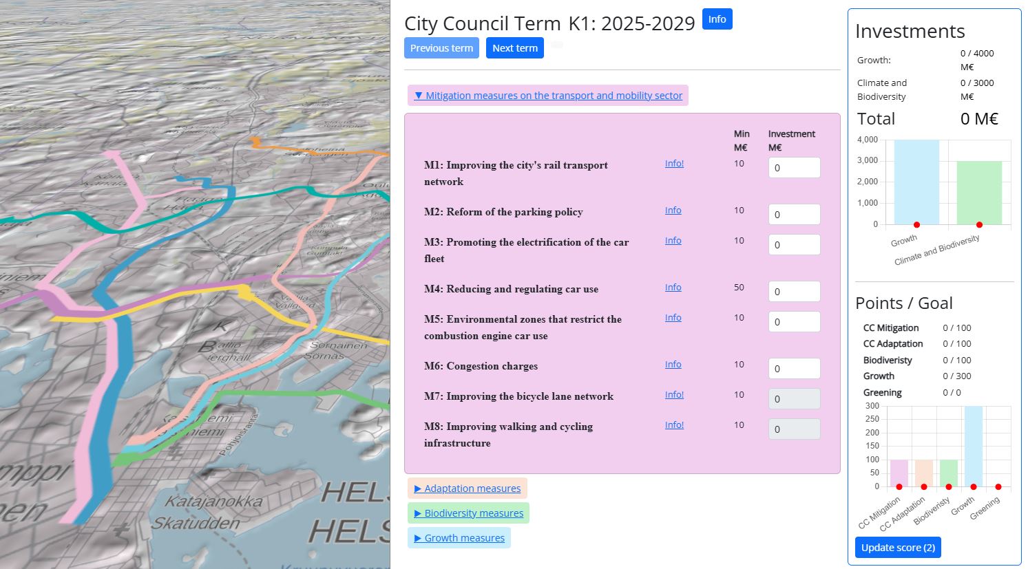 Investoinnit vaikuttavat viidellä keskeisellä osa-alueella: ilmastonmuutoksen hillinnässä ja sopeutumisessa, biodiversiteetissä, viherryttämisessä (vihreiden alueiden määrä) ja kasvussa (asuntotarjonta). Peli jakautuu neljään valtuustokauteen ja investointipäätösten seuraukset tulevat ilmi siirryttäessä seuraaville kausille, samalla kun politiikan muutokset muovaavat pelin sääntöjä kullakin kierroksella. Peli on suunniteltu kaupunkisuunnittelun ammattilaisille, jotka pelaavat omana itsenään pienissä ryhmissä. Me fasilitoimme pelaamista varmistaen, että kaikkien mielipiteet tulevat kuuluviin ja kukin päätös on perusteltu. Pelin tavoitteena on saavuttaa kestävyys- ja kasvutavoitteet vuoteen 2040 mennessä annetun budjetin puitteissa.